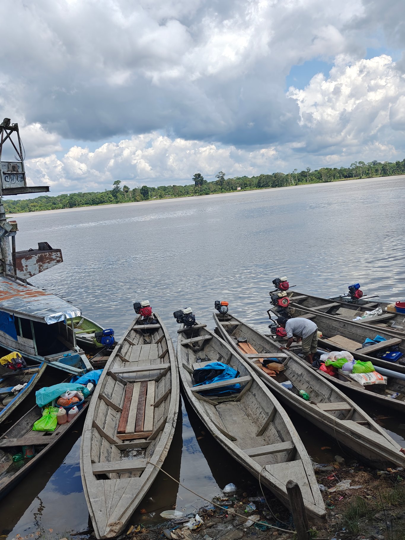 司机如接圣旨,把我载到,还下车陪我四处询问。然后才知道:去这个社区是没有公共船的,我得单独租船。等人帮忙找船时,我看着河上的独木舟,问司机,