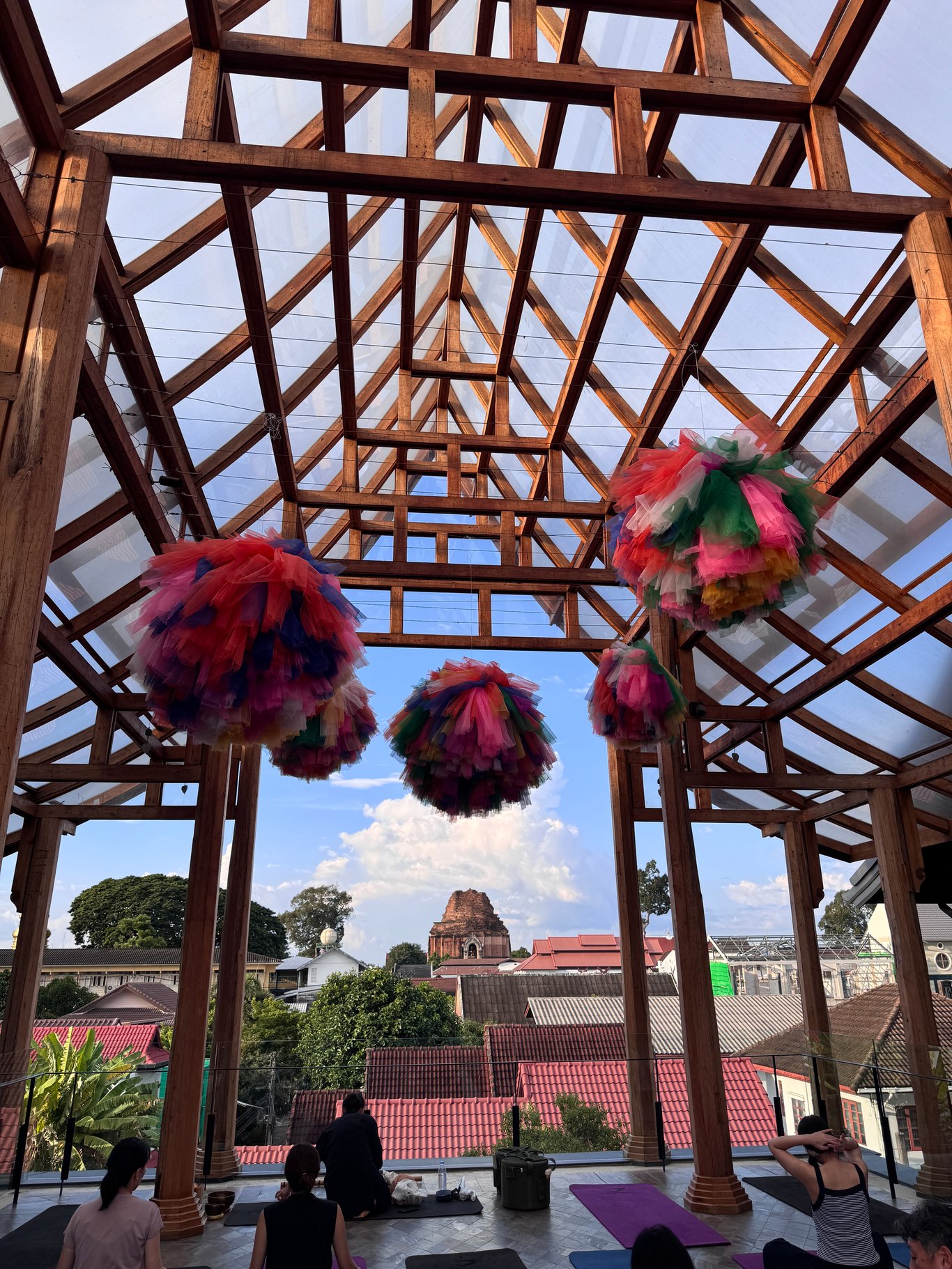 而第三天因為晚餐跟另一組朋友約吃晚飯,中間我安排了一項期待很久的落日瑜珈,就在一個新的藝術村內KALM,一直以來就很想來清邁上課瑜珈課或者是皮拉提斯或者其他體驗課程,這次看到落日瑜珈顧名思義就是邊上瑜珈邊體驗落日,對泰國的規劃及思想真的不得不佩服,從五點開始上課到六點冥想30分鐘,老師最後還頌缽,老師教的動作也不是很難主要是放鬆跟好好享受當下。