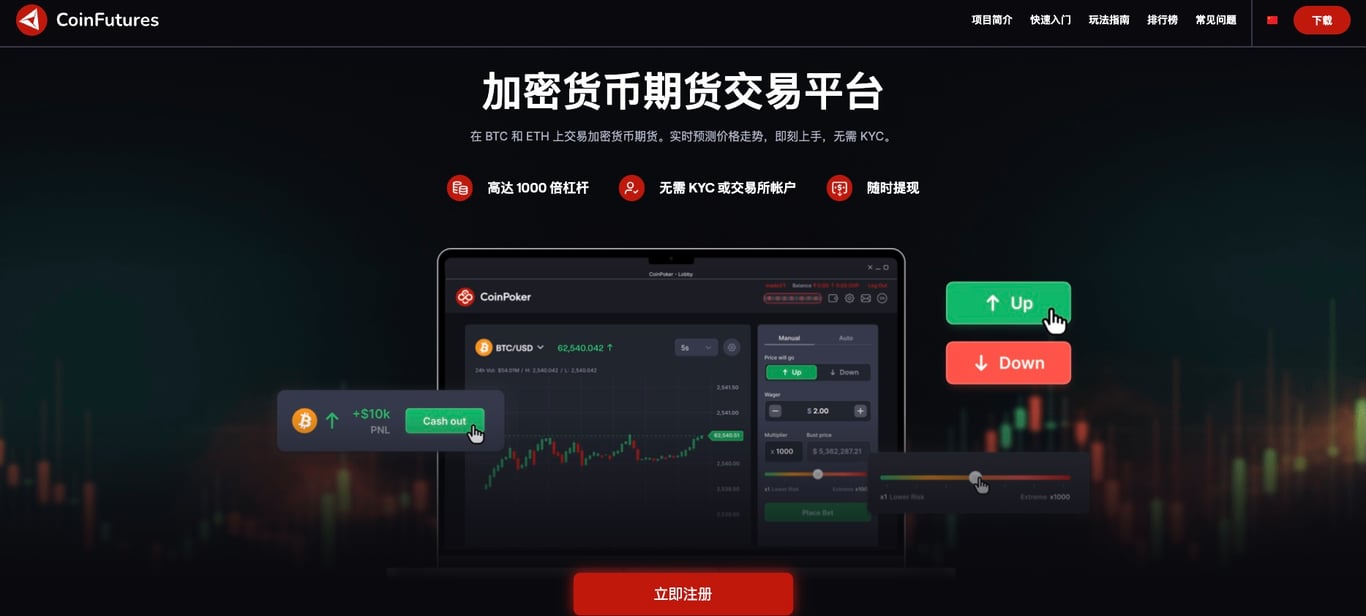 如果想考驗自己對加密貨幣投資眼光,也可使用CoinFutures,這是一個綜合表現優秀的加密貨幣期貨交易平台,主打無需KYC、免註冊帳戶即可交易,並提供仿真真實市場波動的遊戲化交易體驗。用戶可即時預測比特幣、以太幣等主流幣種的價格走勢,並選擇做多或做空,最高可使用達1,000倍的槓桿,亦支援止盈與停損設定。雖然平台不涉及實際加密資產,市場數據為模擬生成,但其高靈活性與免驗證的設計,對短期預測型交易者而言具有吸引力。平台也支援隨時提領收益,操作門坎極低。