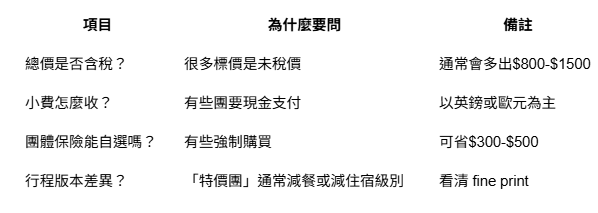 很多旅行社網站上寫的團費,比如「$25,999起」、「$8,999自由行優惠」,其實那個「起」字很關鍵。這些價格通常 不含稅、不含燃油費、小費、保險。所以真正付款時,往往會比官網價格多出8%~15%。