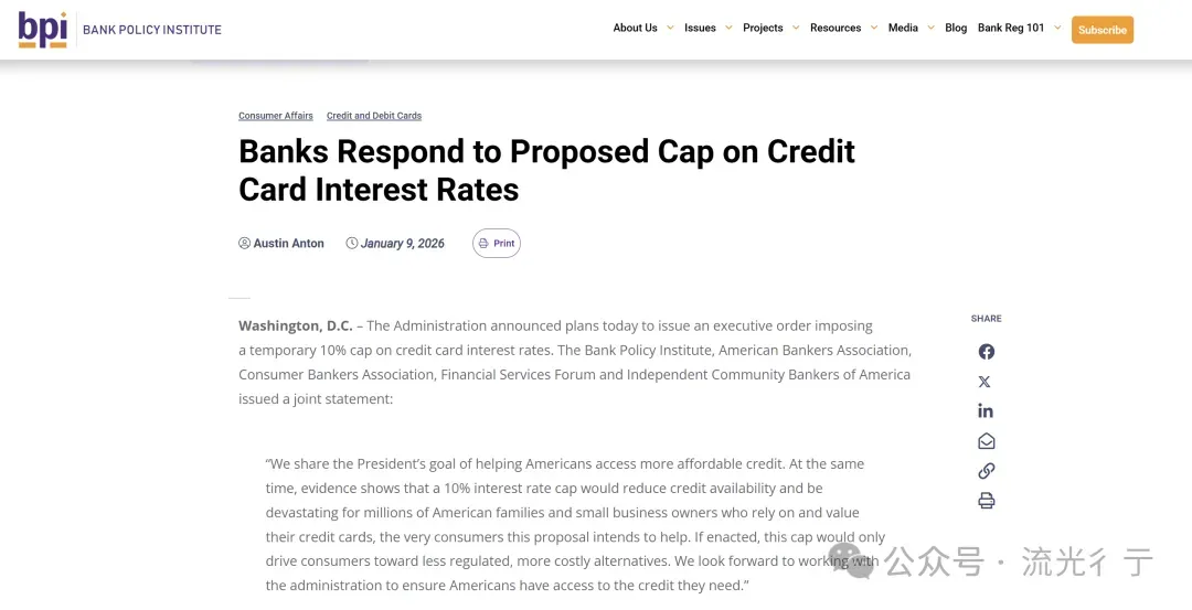 就在美东时间1月9日特朗普发帖当天,包括美国银行政策研究所 (Bank Policy Institute, BPI)和美国银行家协会(American Bankers Association)在内的美国银行业协会发表联合声明,称10%的信用卡利率上限将减少信贷供给,并对依赖信用卡的家庭和小企业主产生不利影响。