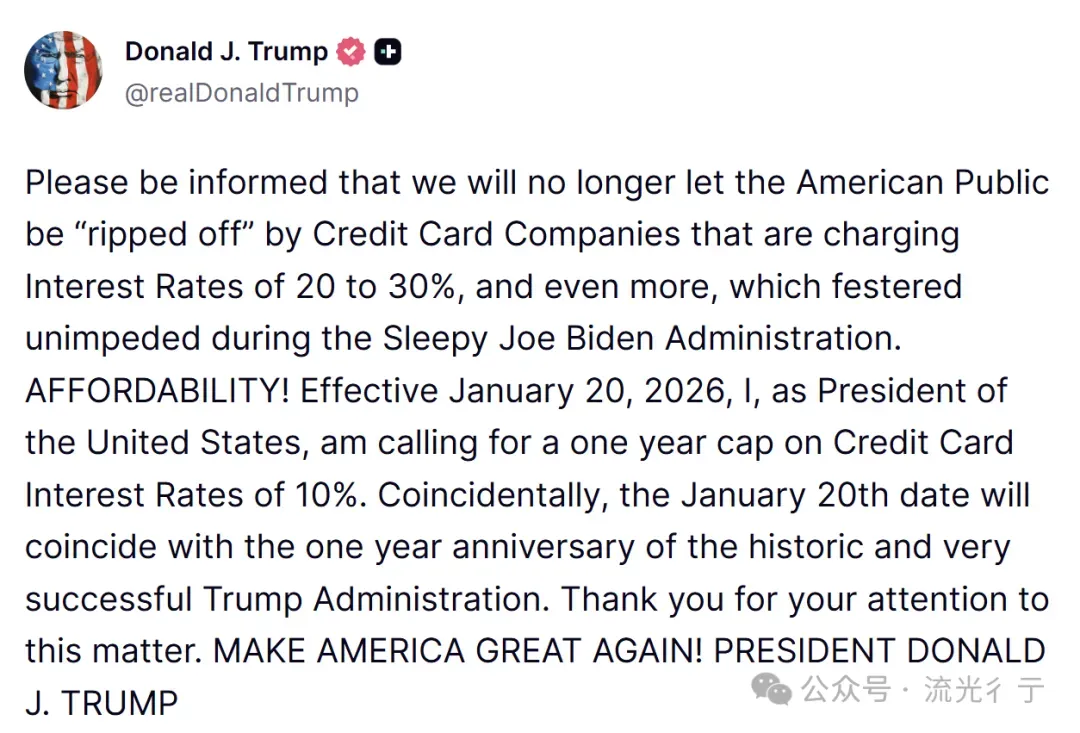 1月9日,特朗普在自己创立的社媒真相社交(Truth Social)上发帖炮轰。帖子简洁如判决:呼吁从本月晚些时候开始,对信用卡利率实施为期一年的10%上限。此后还发帖对信用卡刷卡费提出批评,公开站台《信用卡竞争法案》。
