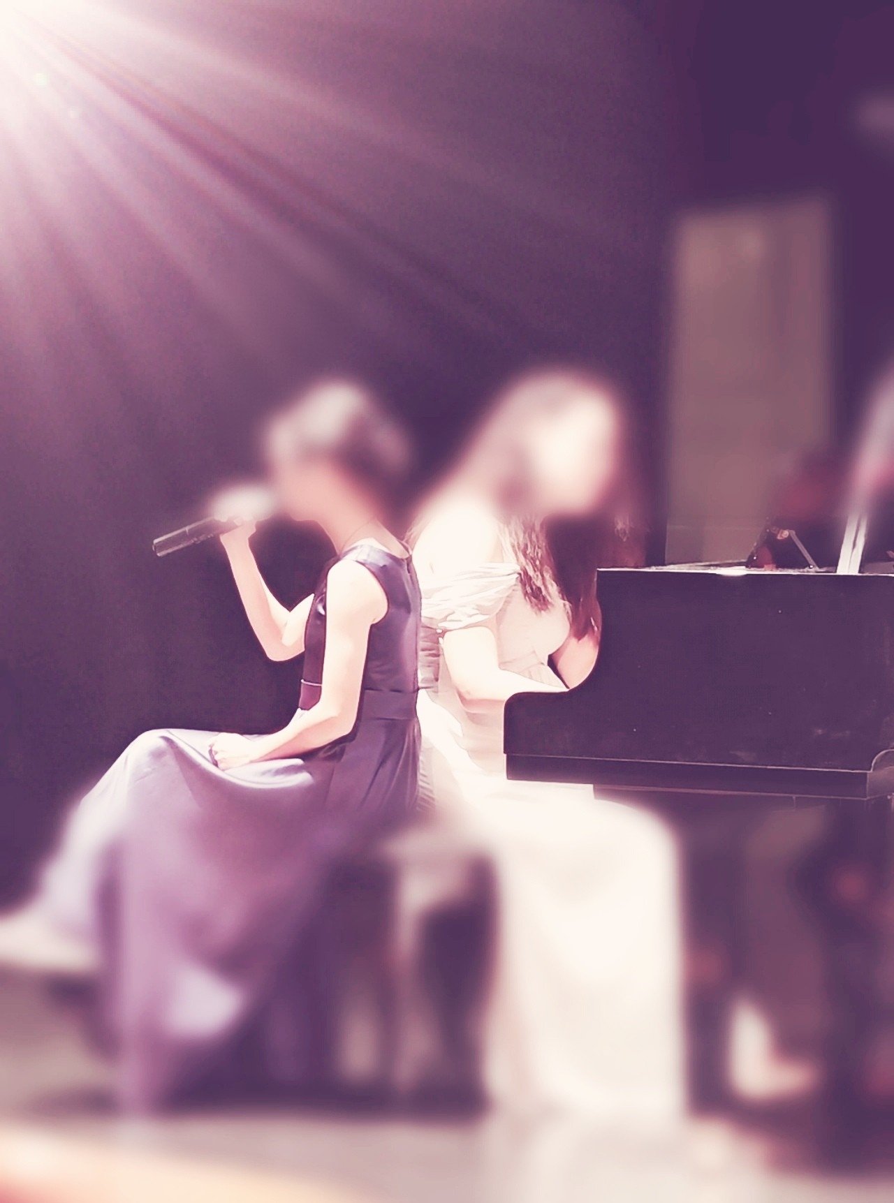 女儿在音乐学校的表演会上演唱 了《可我只是海》。她身着一袭深色长裙,与钢琴老师彼此背对背坐在舞台中央。伴奏响起,琴声轻柔地流淌开来,温柔地托起整首歌的情绪。