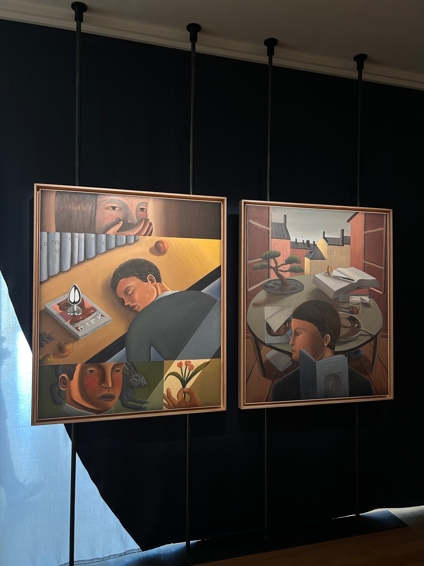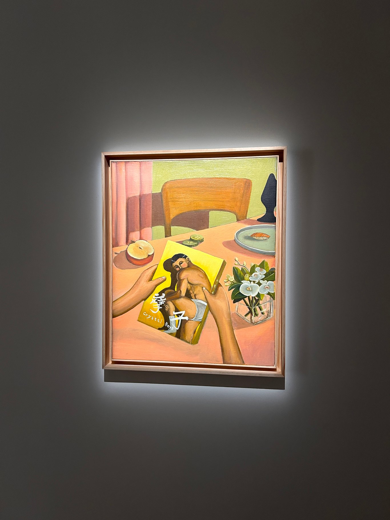 再來是這系列陳柏豪的作品,身為台灣人,他的作品融入了對歷史與個人事件的指涉,展現他對臺灣近代史及酷兒解放運動的持續反思,例如這幅畫描繪了白先勇於1980年代出版的酷兒小說《孽子》的封面,以鮮明的色彩對比進行身份敘事。