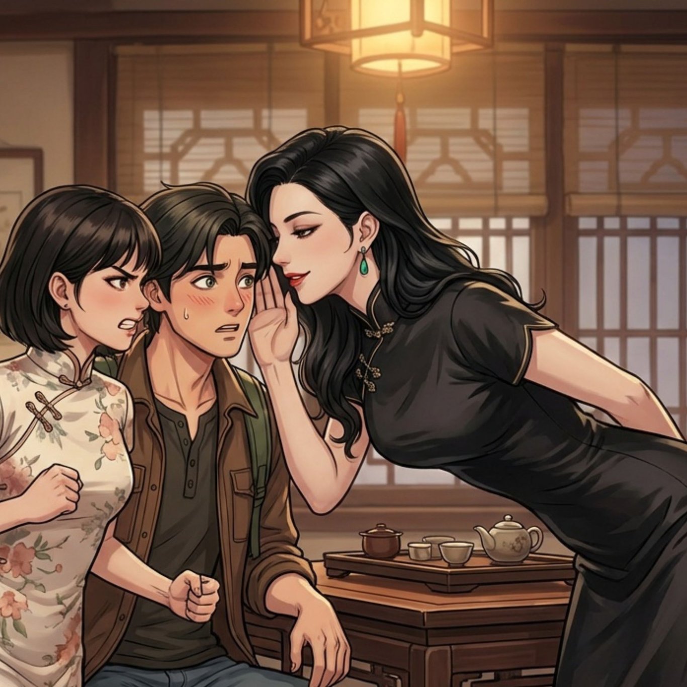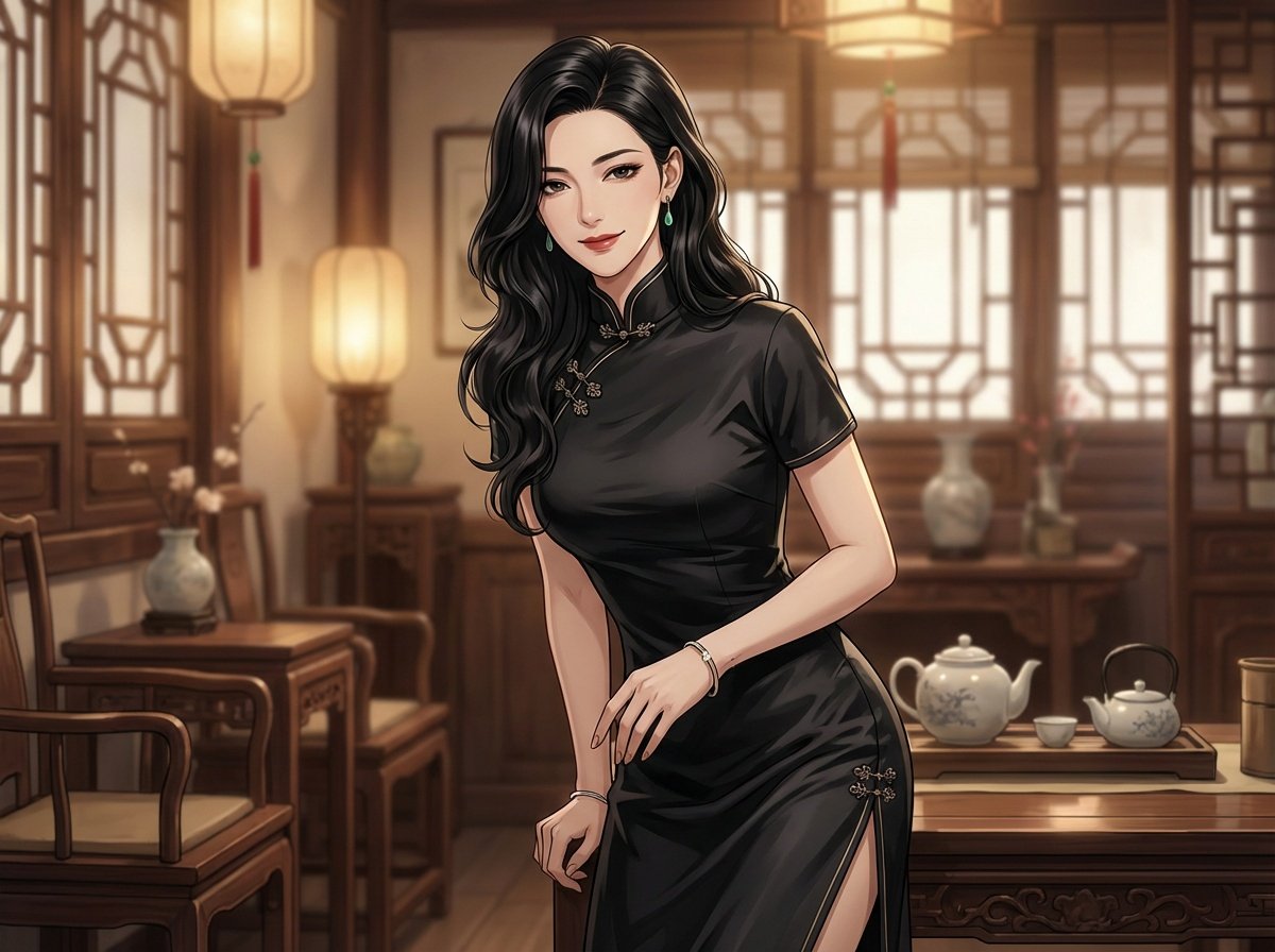 來人年約三十上下,身段高挑,曲線豐滿,穿著一襲剪裁貼身的黑色旗袍。布料沿著腰線與腿側自然垂落,既不張揚,卻讓人一眼就移不開視線。