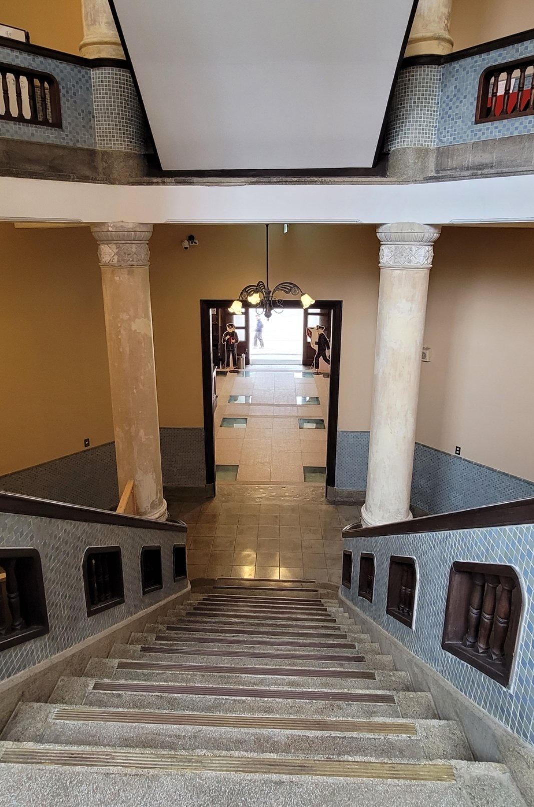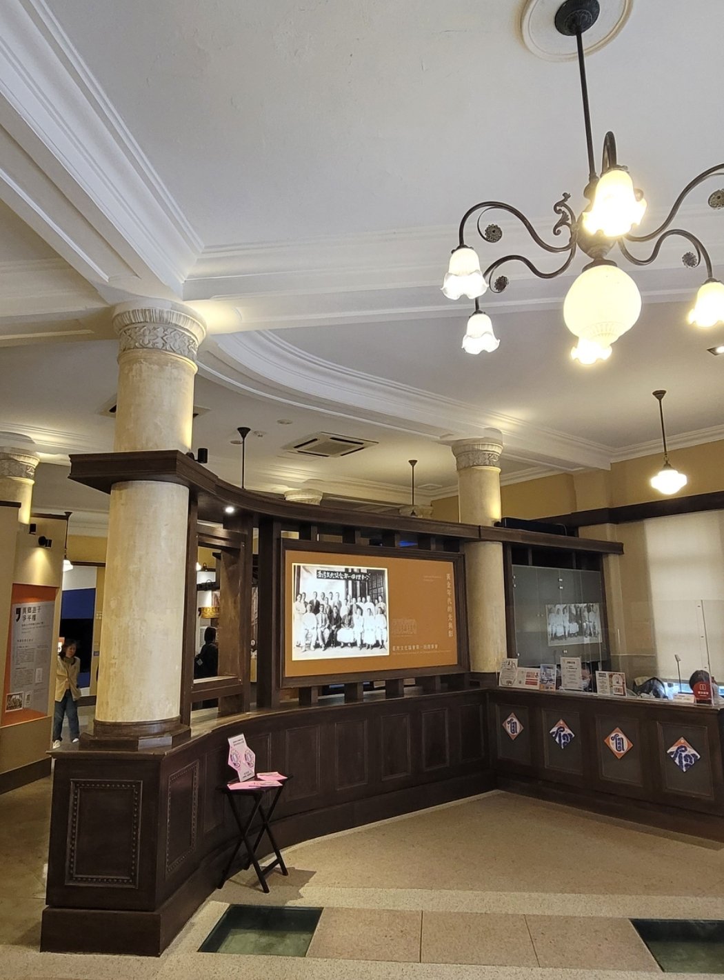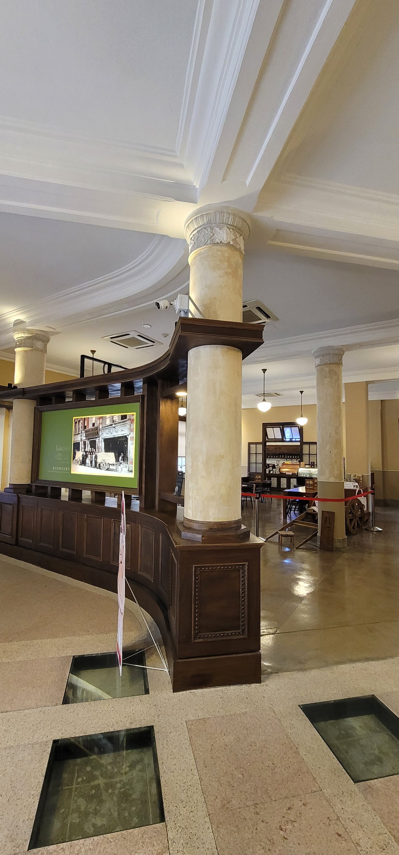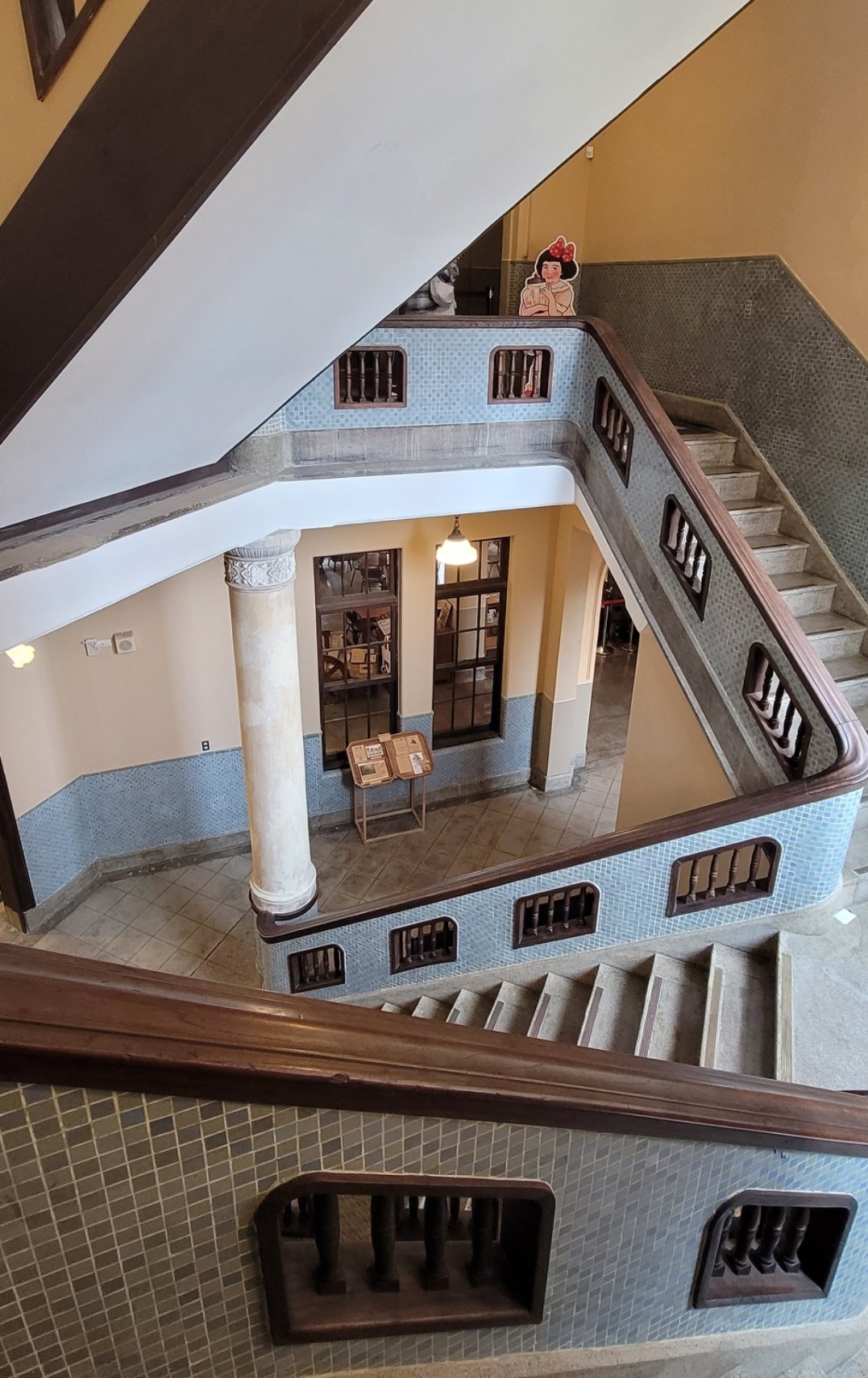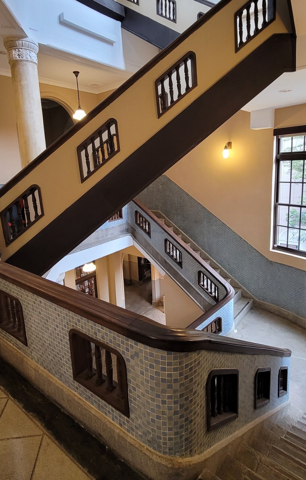 西式圓柱撐起空間高度,道出了過往的威嚴,兩側旋轉而上,馬賽克磚與中間木格柵簍空的樓梯,堆疊出建築華麗的時代美感。