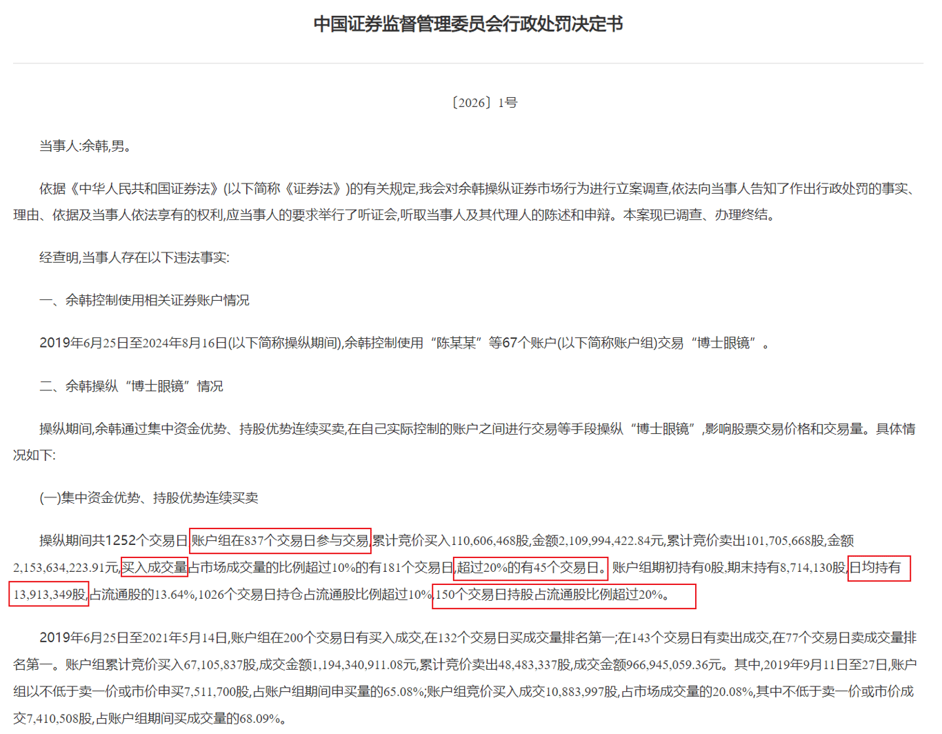 这张罚单,也是2026年的“1号罚单”,主角余韩,用了5年时间,做了一场“专注”的实验:他只盯着一只股票反复炒作——博士眼镜。