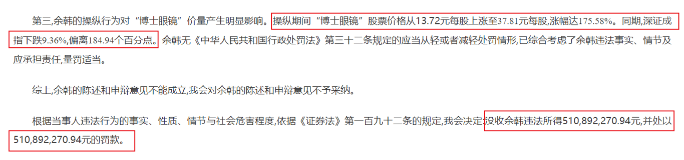 在他“精心照料”的5年里,博士眼镜股价逆势从13.72元每股上涨至37.81元每股,涨幅高达175.58%。而同期深证成指下跌9.36%。他个人从中榨取5.1亿元的利润。当然,现在这笔钱连同等额罚款,共计10.2亿,都已成为“往日传说”。