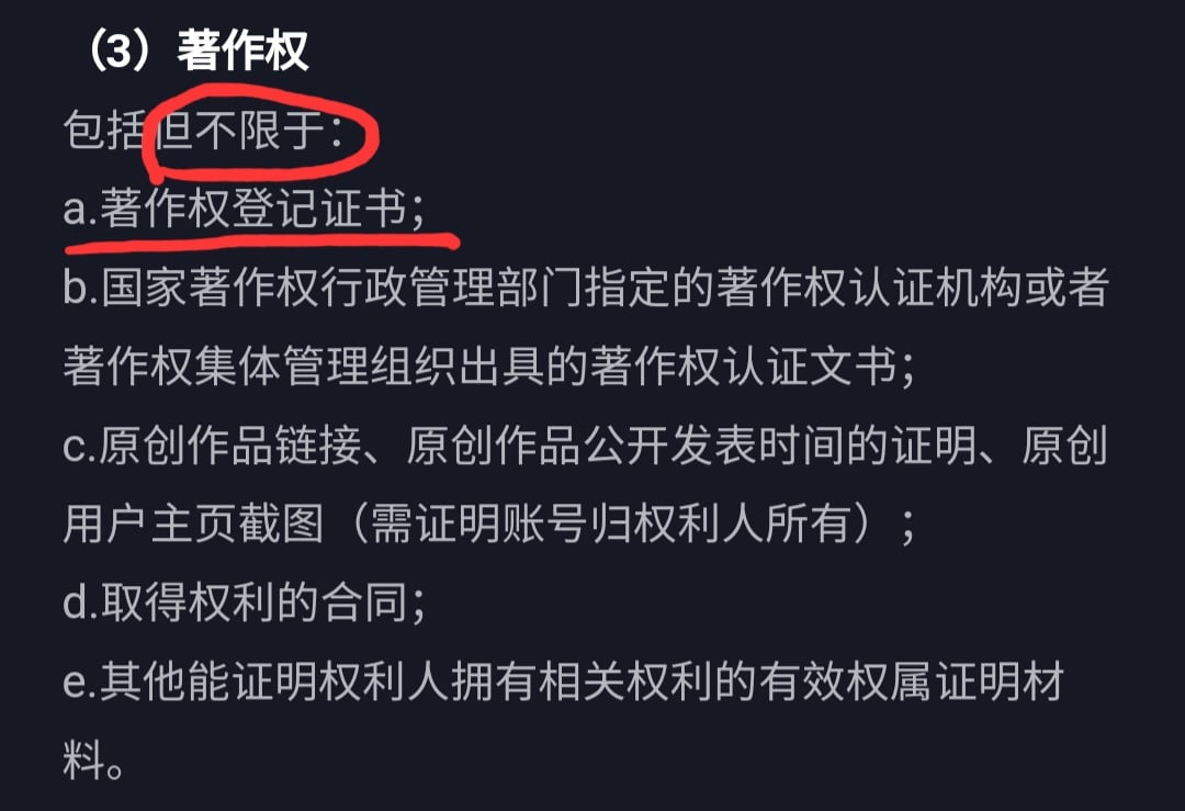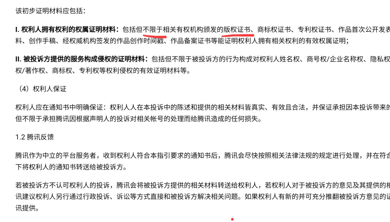 而且,就算我真的肯下这个血本去申请那个狗屁“著作权登记证书”,也不能保证平台就会帮我维权,因为它们已经规定了被侵权者需要提供的资料包括“但不限于”下面列出的那些东西。“不限于”是啥意思呢?如果我没有理解错的话,就是他们可以永远找出各种理由要求侵权受害者提供各种难以提供的材料,直到把受害者折腾死。