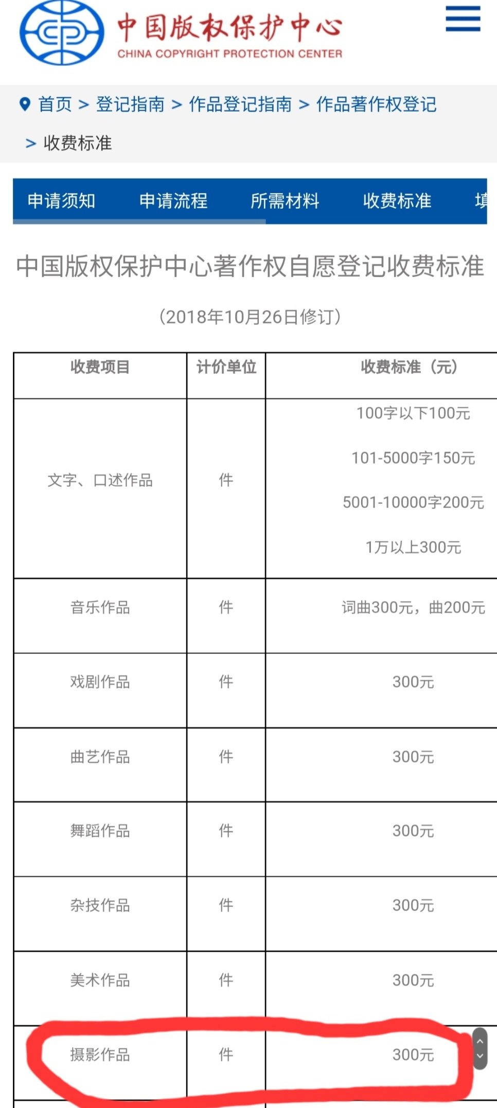 那么这个“著作权登记证书”如何获得呢?我又在网上搜了一下,原来居然要到一个叫做“中国版权保护中心”的机构去申请。当然这个申请不是免费的,比如说摄影作品,每件(每幅)需要缴纳300元的申请费: