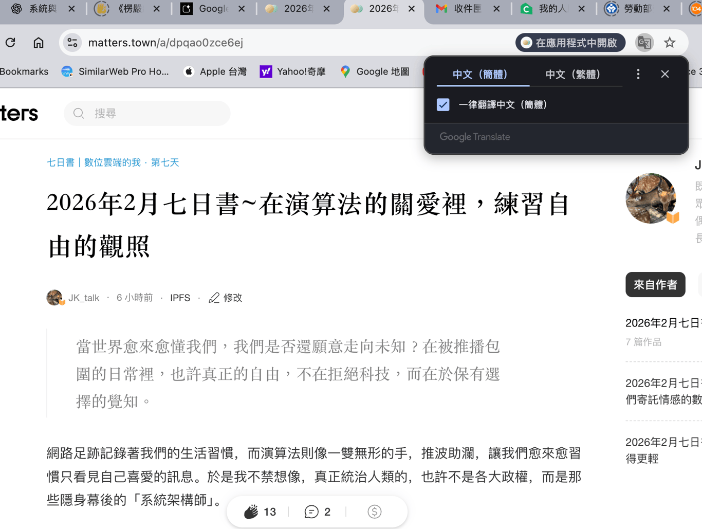 以下是我截取下來的畫面,與大家分享這個有點魔幻的小插曲。取他人的眼球,更不存在流量的焦慮。而且把重心放在與他人的交流上,這也是我喜愛matters的主要原因。