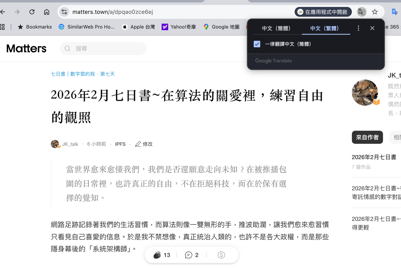我慢慢發現,傳統社群媒體與 matters 最大的差異,或許就在於閱讀的深度。