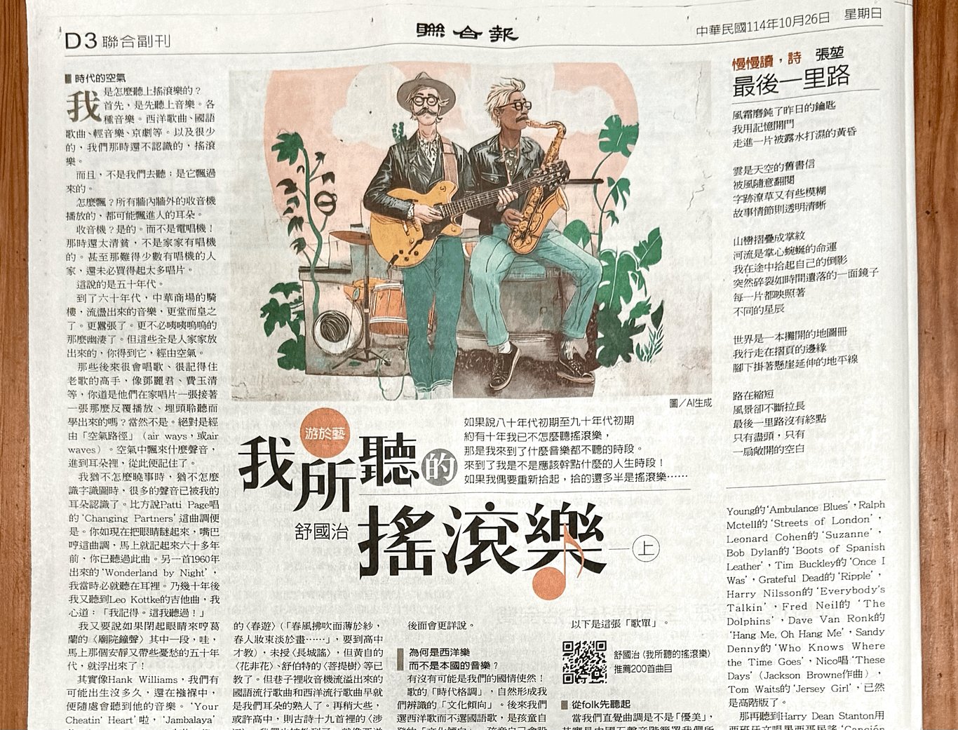 舒國治的新書寫他年輕時聽搖滾樂的故事,其實在去年十月已分成三篇節錄在聯合報副刊上,恰巧我家有訂(在這年頭還有人訂報!但不是我,是家人),所以看到後來集結成書也不意外。他的聆聽以六七〇年代之交的西洋搖滾樂為大宗,那洽是搖滾樂最光輝壯盛的時期,也是他二十歲上下的舊時回憶。反觀我搖滾聽到老未曾放棄過,雖然我聽的也大多是老東西;所以,這書我還是買下收著。