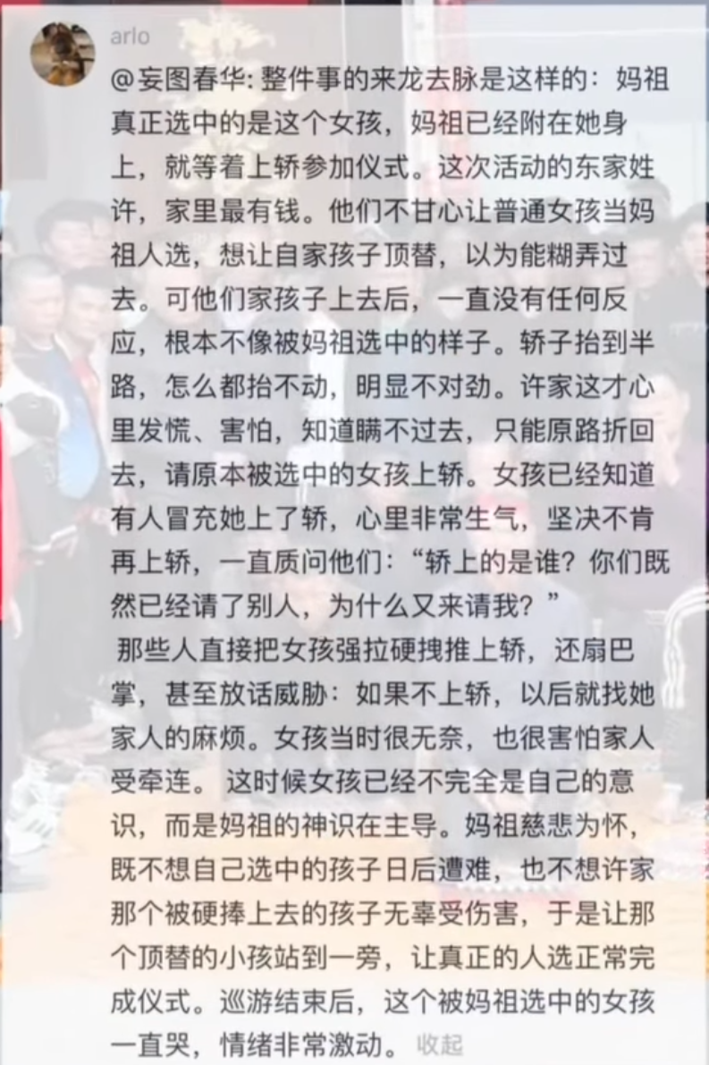 總之呢,就是大多數女性一提起這個福建地區以及這個山東地區,嗯,都有一種捏鼻子的衝動。 我又扯遠了。但是我要說的是今天這個事情。就我大概了解一下小媽祖事件是今年過年的時候,他們又再次舉行永神。而這個小媽祖已經連續8年被選中了。我不知道怎麼選啊?他們選中「媽祖」好像是用這個值聖杯的形式。總之呢,就是選好了「媽祖」以後,小媽祖已經換好了紅衣服,準備上轎了。結果上轎之前,就被一個男孩穿著全紅衣服的男孩給頂替了。這個男孩有兩種說法,一種說法是春之書的孩子,另一種說法是最大的投資商的孩子。反正不管是怎麼樣,也有可能兩個都是吧,不是權就是錢,也有可能既有錢又有權。總之就是這個男的上了轎,然後這個女孩不讓他上了。然後這個轎子呢,就是有兩個說法,也是一種說法。一種說法是轎子抬不動,還有一種說法就是轎子只是重,能夠抬動,但是抬到那個路口的時候,他們直這個聖碑就是九次都出現了陰碑。然後就是他們不敢直這個第九次,因為如果八次都是陰碑,他們不敢直這個第九次,因為如果九次都出現陰碑的話,就是大凶。於是呢,他們就把這個轎子弄回來,繼續要讓這個女孩上轎。但是呢,女孩就拒絕不上轎。然後有很多留言吧,當地人留言就說因為女孩不上轎,拒絕上轎,然後那個不知道是投資方的人呢,還是村子叔的人,總之就啪啪給了女孩幾巴掌,然後就是還威脅她說要動她的家人。然後這個女孩就哭哭啼啼的上了轎。