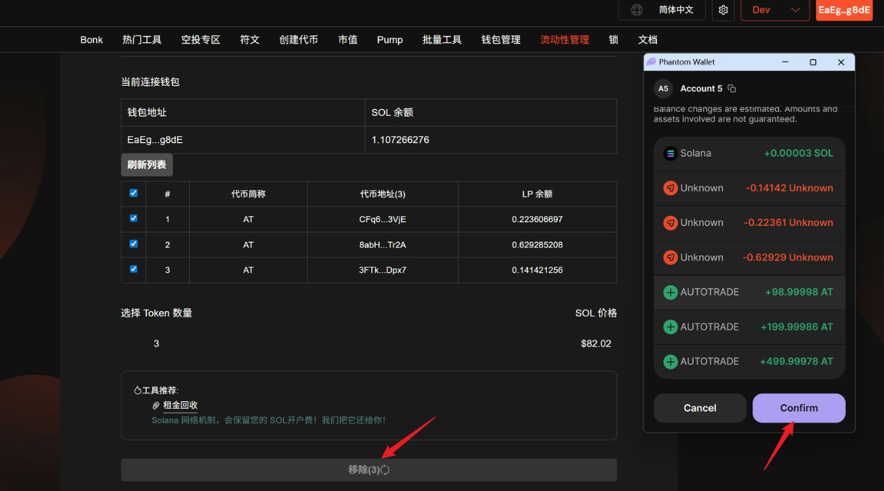 钱包余额:确保钱包中有足够的 SOL 余额(每笔流动性移除需 0.001 SOL)。