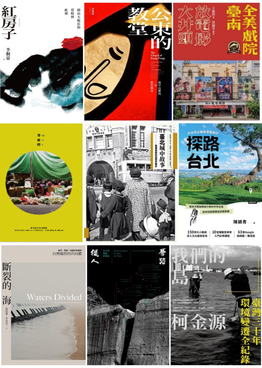 ▶在地路線書單 【特寫】《紅房子:圓山大飯店的當時與此刻》(李桐豪著,鏡文學出版,2022) 【特寫】《公東的教堂:海岸山脈的一頁教育傳奇》(范毅舜著,本事文化,2012) 【特寫】《大井頭放電影:臺南全美戲院》(王振愷著,遠足文化,2021) 【中景】《鹽埕老派生活指南》(曾國鈞、邱承漢、羅文昕、陳坤毅、黃祺瑋、張雯祺著,叁捌地方生活文化有限公司,2020) 【中景】《臺北城中故事》(蘇碩斌、林月先、高傳棋、凌宗魁、鍾淑敏、徐明瀚著,左岸文化,2019) 【中景】《探路台北》(陳穎青(老貓)著,時報出版,2023) 【鳥瞰】《斷裂的海:金門、馬祖,從國共前線到台灣偶然的共同體》(何欣潔、李易安著,聯經出版公司,2022) 【鳥瞰】《獵人帶路-曾文溪溯源影像誌》(龔卓軍主編,陳伯義、張景泓、莊榮華攝影,臺南藝術公社,2020) 【鳥瞰】《我們的島:臺灣三十年環境變遷全紀錄》(柯金源著,衛城出版,2018)