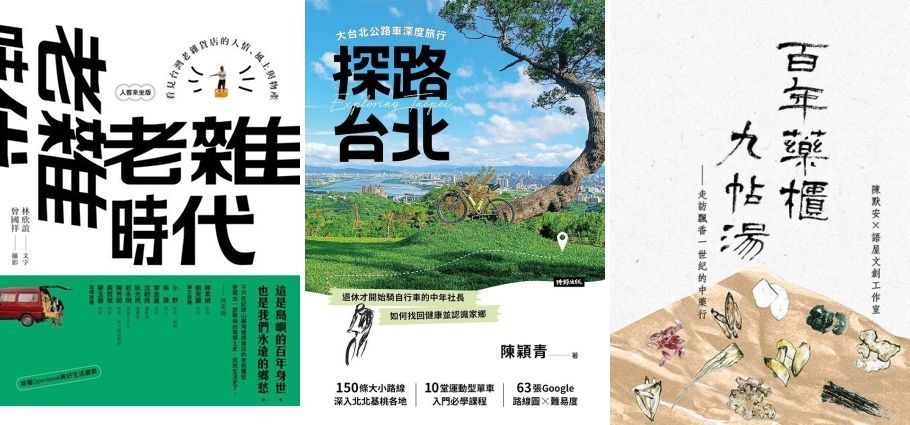 台灣每年出版近4萬本圖書,不少作品是作家一次又一次走訪城鎮田野,用生命經驗、文史素材與學術視野,記錄下台灣的豐富與多元。比如作家林欣誼與攝影師曾國祥合作的《老雜時代》,探訪了32間台灣即將消失雜貨店風景;出版人陳穎青《探路台北》規畫了150條深入北北基的腳踏車路線;作家陳默安《百年藥櫃九帖湯》走訪了9間飄香百年的中藥行。