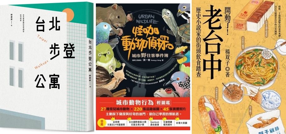 「中景」的書籍,則可以作為2日遊、3日遊按圖索驥的指標,綜覽單一城鄉、物種、事件、主題或社群。比如林君安《臺北步登公寓》探索了臺北的住宅類型是如何形成的。科普作家黃一峯一手包辦文字、繪畫和攝影的《怪咖動物偵探》,以動人的圖文整合,聚焦且不冗雜的帶讀者認識20多種城市常見生物。楊双子《開動了!老臺中》則從日治時期少女吃什麼的想像出發,連結到作家自己生活過的街區,記錄踏查臺中舊城區的飲食。