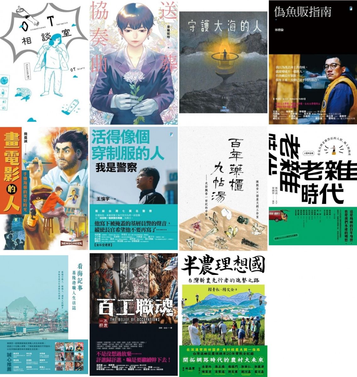 ▶職人書單 【特寫】《OT相談室》(Elainee藍尼著/繪,慢工文化事業有限公司,2020) 【特寫】《送葬協奏曲》(韋蘺若明著,蓋亞文化,2020) 【特寫】《守護大海的人》(玉米辰著,交通部航港局,2021) 【特寫】《偽魚販指南》(林楷倫著,寶瓶文化,2022) 【特寫】《畫電影的人:手繪海報的美好時光》(簡嘉誠著,蓋亞出版,2021) 【特寫】《活得像個穿制服的人:我是警察》(王惀宇著,寶瓶文化出版,2023) 【中景】《百年藥櫃九帖湯:走訪飄香一世紀的中藥行》(陳默安、語屋文創工作室著,李綻扆繪,松鼠文化有限公司,2021) 【中景】《老雜時代》(林欣誼、曾國祥著,遠流,2017) 【中景】《看海記事:基隆港職人生活誌》(好風土文化有限公司, 葉奕緯, 鄭詩怡, 林佳慧, 田美子, 施博文, 戴秀真, 廖芷瑩, 林靜怡著,蔚藍文化出版,2022) 【鳥瞰】《百工職魂》(目映.台北著,寶瓶文化出版,2021) 【鳥瞰】《半農理想國》(賴青松、楊文全著,遠流,2022)