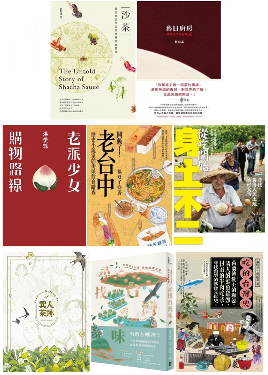 ▶飲食書單 【特寫】《沙茶:戰後潮汕移民與臺灣飲食變遷》(曾齡儀著,前衛出版,2020) 【特寫】《舊日廚房》(詹宏志著,新經典文化,2022) 【中景】《老派少女購物路線》(洪愛珠著,遠流,2021) 【中景】《開動了!老台中》(楊双子著,林凡瑜(Fanyu)繪,玉山社,2021) 【中景】《身土不二,從吃開始:尋找善待人與土地的好食物》,(寫寫字採編學堂著,遠流出版,2020) 【鳥瞰】《異人茶跡》(張季雅著,蓋亞,2021) 【鳥瞰】《尋找台灣味》(地理角團隊著,左岸文化,2020) 【鳥瞰】《吃的台灣史》(翁佳音、曹銘宗著,貓頭鷹,2021)