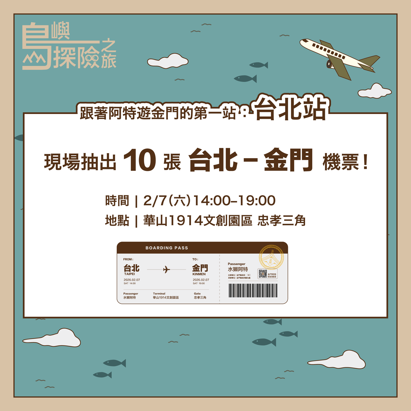 「跟著阿特遊金門的第一站:台北站」將於 2 月 7 日(六)下午 2 點至晚間 7 點,在華山文創園區忠孝三角區域登場。活動選擇台北作為起點,正式揭開角色 IP 與金門旅遊主題的首波亮相,透過角色展示與互動體驗,提前為金門觀光暖身。