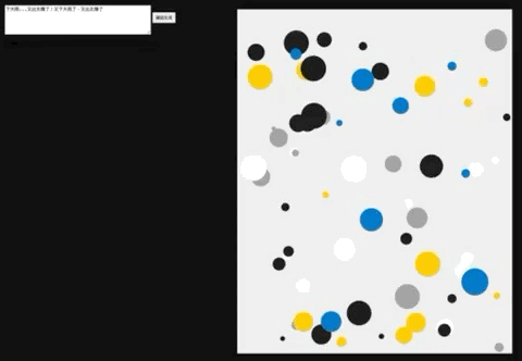 接著來看一些本週的練習吧~下面這件作品是串接 AI 的 API (謝謝老師的錢錢),讓使用者輸入一些心情,接著 AI 會把它轉換成顏色,最終變成畫面上有顏色的小球。由於這個平台無法放上影片,所以我把作品的影片變成 GIF 檔案(但畫質好差......)。左上角的心情是:「下大雨...又出太陽了!又下大雨了!又出太陽了!」,然後 AI 給我了下面這樣的配色。