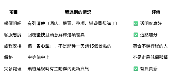 說真的,現在旅行社很多,價格也差不多,但服務、應對突發狀況、細節處理真的差很多。我之前踩過雷:出發前一天臨時加錢、報團之後客服消失、酒店跟行程完全不符……所以後來我自己總結了一套挑選旅行社的「四步驗證法」。