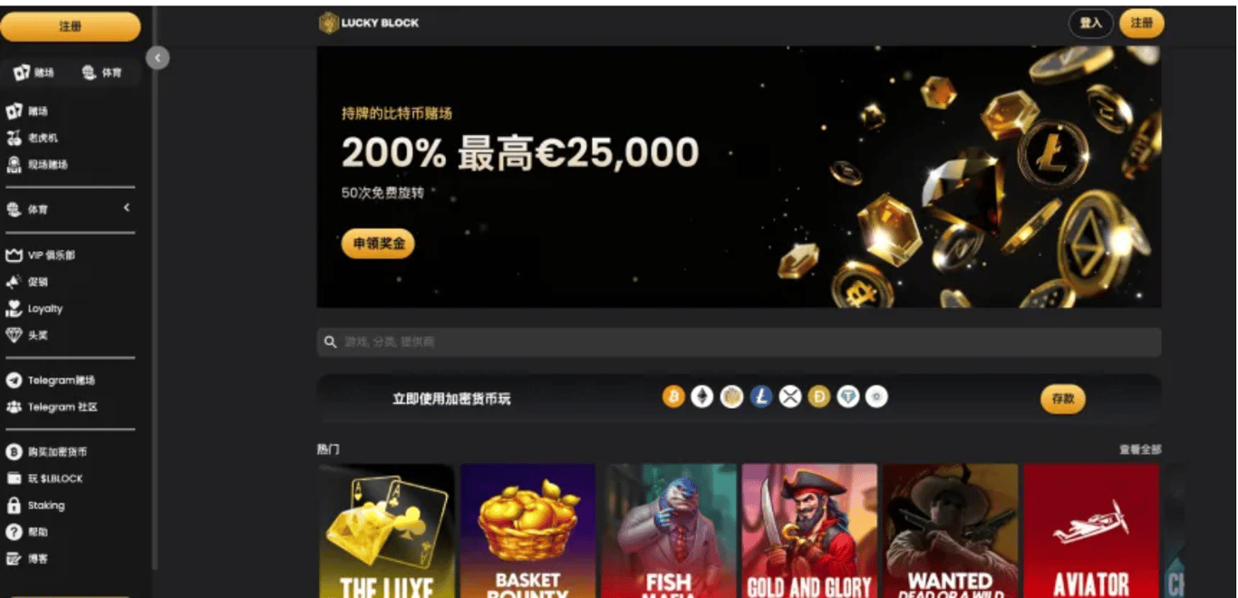 它跟 Lucky Block 有點像——同樣支援 22 種加密貨幣、同樣有高額200%迎新獎金,也同樣持有庫拉索和安焦昂雙重牌照——但最大的差別是:它同時整合體育投注與賭場娛樂。