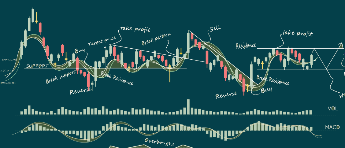 技術指標是數學統計工具,用於協助解讀價格與動能:MA(移動平均線):觀察長短期趨勢交叉,如黃金交叉與死亡交叉。