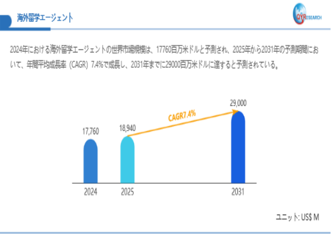 QYResearchが最新発表した「海外留学エージェント―グローバル市場シェアとランキング、全体の売上と需要予測、2026~2032」市場調査報告書によると、世界海外留学エージェント市場規模は2024年の約17760百万米ドルから2025年には18940百万米ドルへ着実に成長し、予測期間中に7.4%の複合年間成長率(CAGR)で拡大を続け、 2031年には29000百万米ドルに達する見込みである。