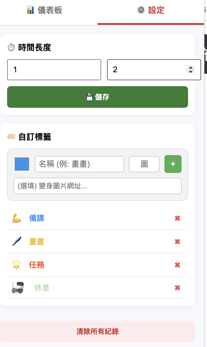 也可以自己制定時間,左工作時間,右休息時間,制定書籤,選擇顏色,選擇圖片(圖片要貼上有圖片格式的網址才會在按下的時候出現那個圖片),也可以把資料全部刪除。