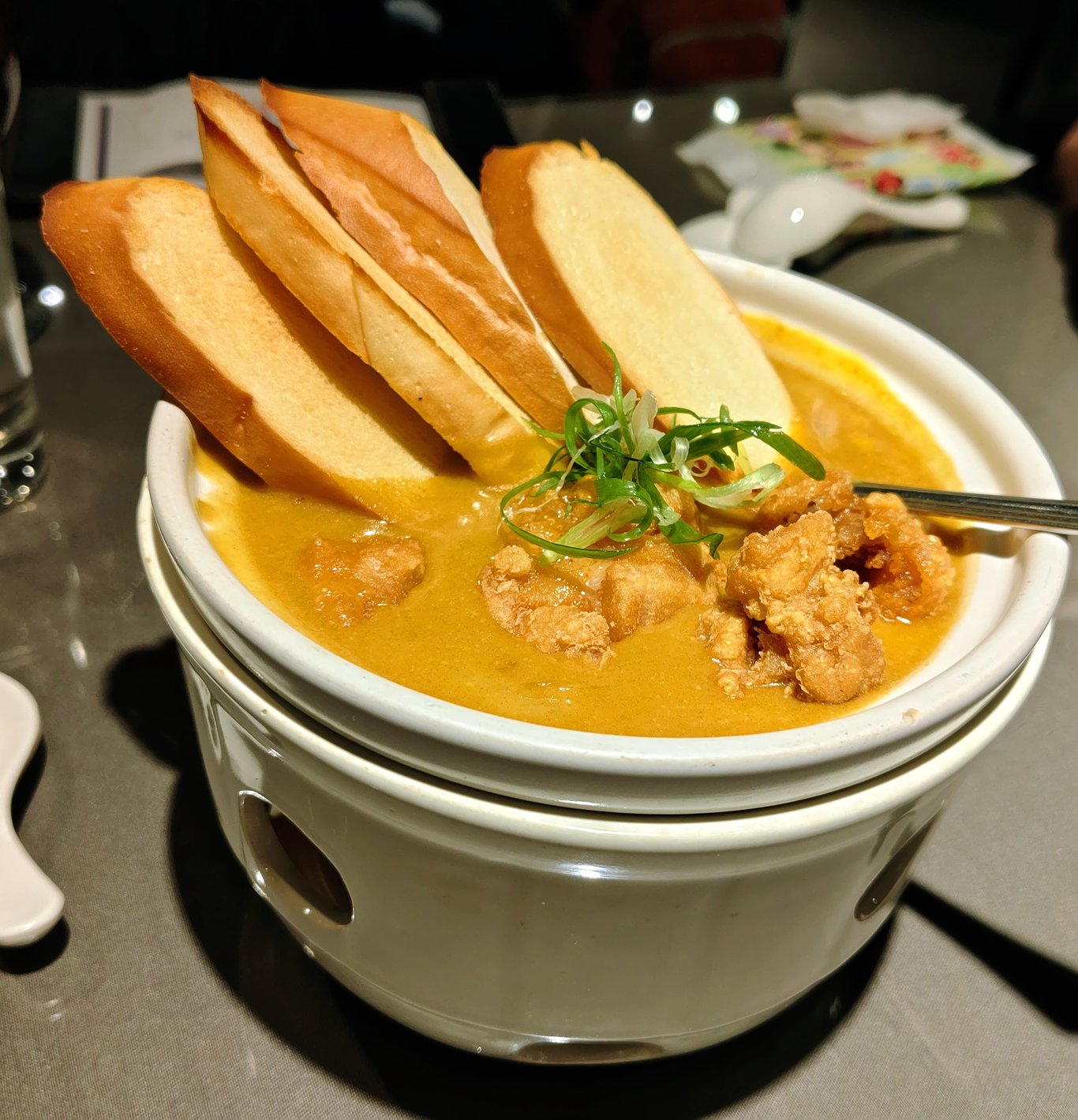 不同於一般燉煮的雞肉,他們在咖哩中放的是炸雞,旁邊再放上乾脆的麵包片。結果發現炸雞配上咖哩醬風味更佳,麵包片沾了咖哩醬也變得軟韌夠味有嚼勁,每一個元素都出現了更美味的化學變化~