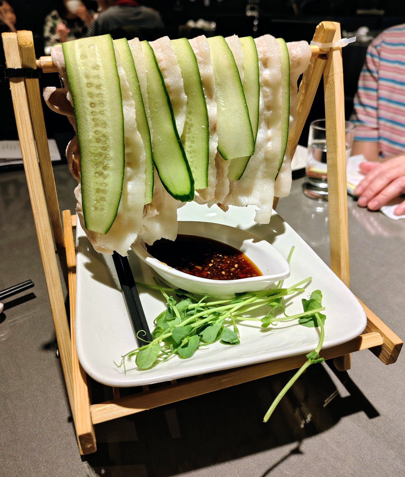 切得極薄肉質軟嫩的豬肉,搭配清脆的小黃瓜片,佐以甜鹹比例極佳的醬汁,從肉品出菜的擺盤風格到口感,都讓人驚艷。