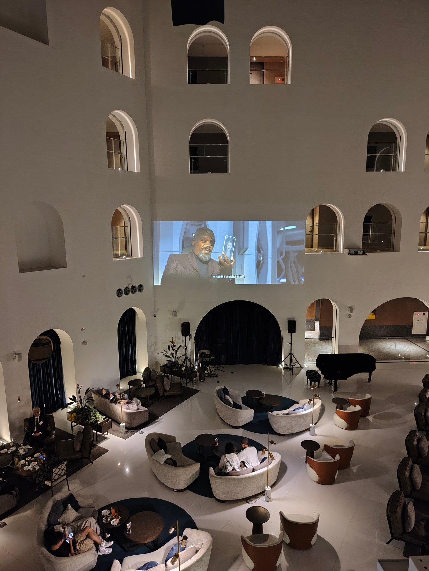 飯店 Lobby 的 Loungr Bar 設置在建築體的天井之下,呈現出獨特的挑高空間感,樓上住房的房客一出房門也可以俯視整個 Bar,所以當有歌手演唱時,整個飯店都會有音樂流瀉,透過這天井的共鳴,連樓上房客都可以聽到。晚間固定時段還會撥放電影,利用特有大片的白色牆面投影,營造出十足的氛圍感。
