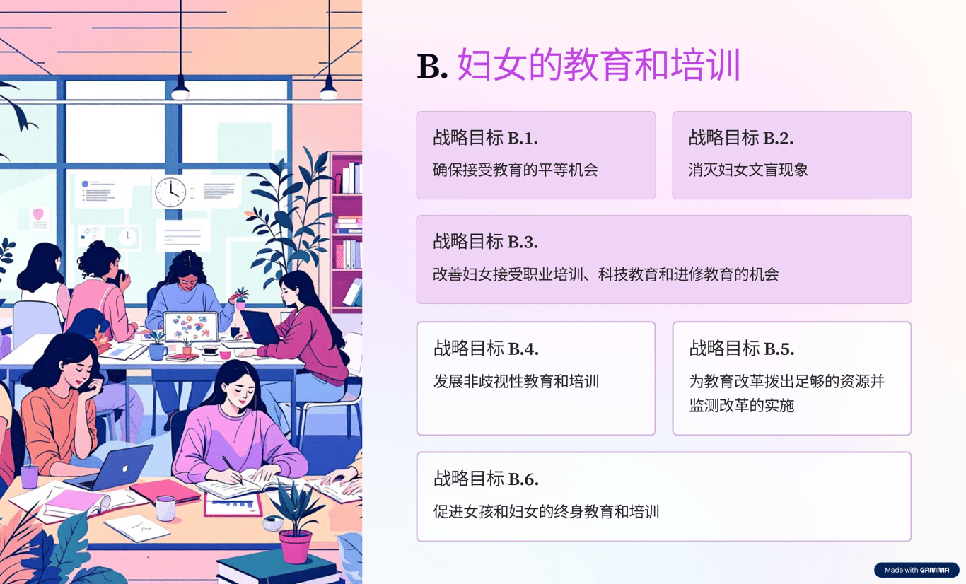 以下是我们的第六篇推送,聚焦于“妇女的教育和培训”。教育和培训的不平等和不足,是导致性别不平等的重要根源之一,非歧视性教育则是保障女性有权力参与社会决策的关键工具,既包括正规教育也包括非正规教育和培训。
