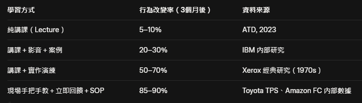 從「痛點」出發,而非從「課程大綱」出發只有「痛到受不了」,成人學習動機才會被徹底打開。現場出問題→立刻教→立刻改,這才是最高效的學習迴圈。