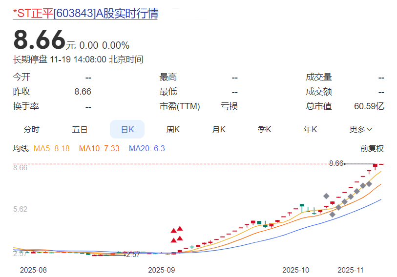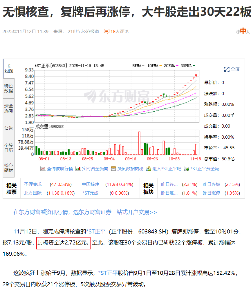 跟*ST东易类似的,还有最近停牌核查的*ST正平,今年9月至11月,短短2个半月,累计涨幅超过200%,应该也是资金方所为,因为11月12日,刚完成停牌核查的*ST正平复牌即涨停,封板资金达2.72亿元。几乎明牌告诉你:我就拉涨停了,怎么着?