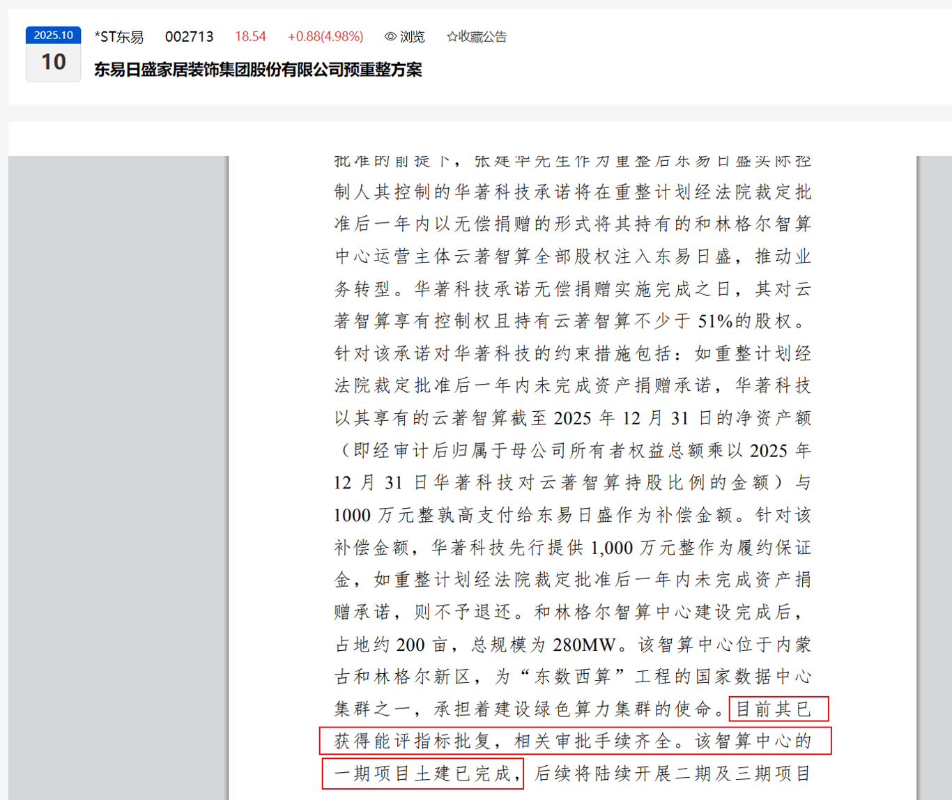 从表面上看,*ST东易披露了预重整相关公告,公告显示,华著科技承诺将在重整计划经法院裁定批准后一年内,以无偿捐赠的形式,将其持有的和林格尔智算中心注入东易日盛,推动业务转型。