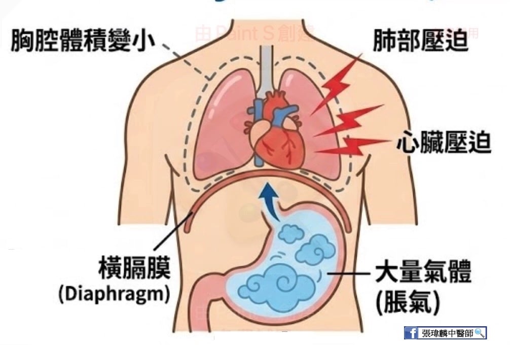 這會壓縮胸腔空間,壓迫到心臟與肺部,導致胸悶、喘不過氣,甚 至刺激神經產生「胸痛、肋骨痛」。