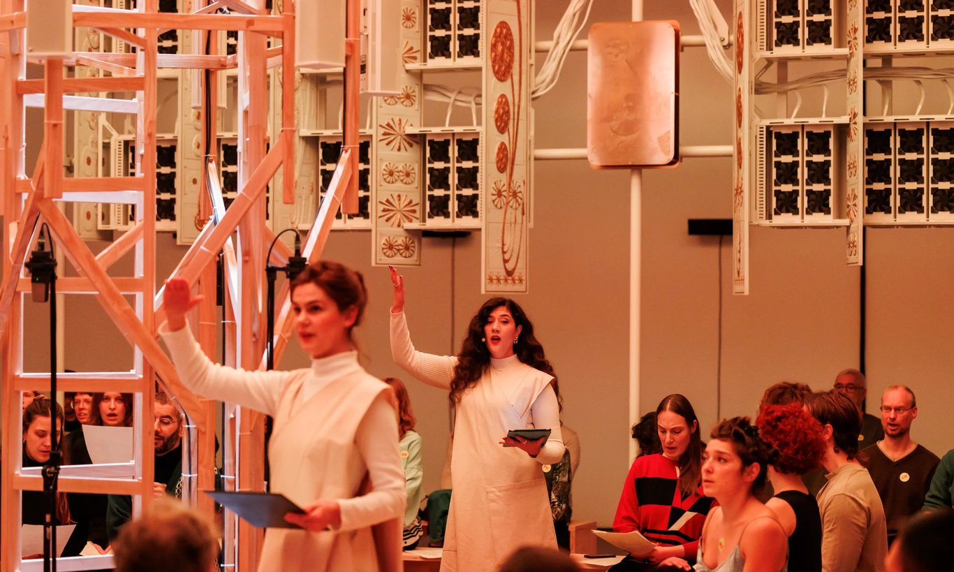 Holly Herndon 和 Mat Dryhurst 於 KW Institute for Contemporary Art 展出 “Starmirror”,探討 AI 模型協調人類生成集體智慧的想像。此作將協議本身視為創作媒介,把展廳轉化為人機協作訓練場。展期內,訪客與合唱團將參與 AI 訓練的呼應問答環節,這些錄音將用於訓練柏林 AI 合唱團。此展挑戰公眾對 AI 的恐懼,鼓勵參與定義 AI 的過程,主張「能動的社會調解而非社群媒體」。⠀⠀