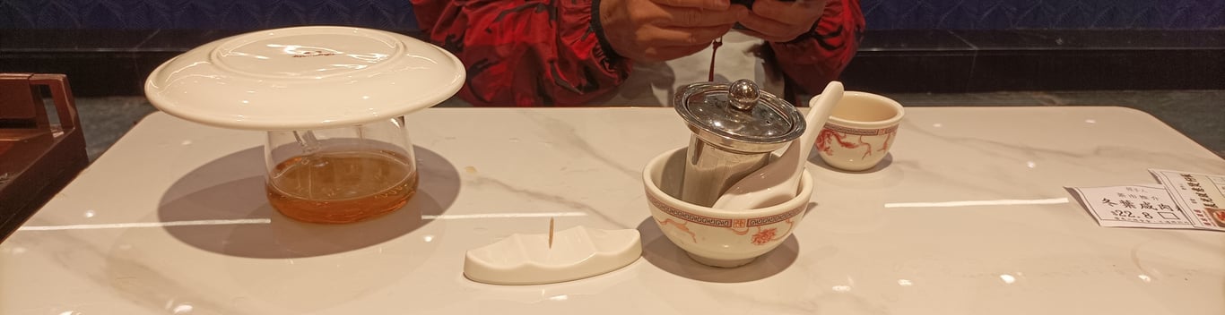 掃興的是同檯搭了一個怪客,好端端的茶壺卻被他「分了屍」,把茶壺的蓋子放到了碗中,卻用墊杯的碟子用來蓋住茶壺,行為怪怪的,讓人看了很不舒服,這樣的怪客過去遇上不少。
