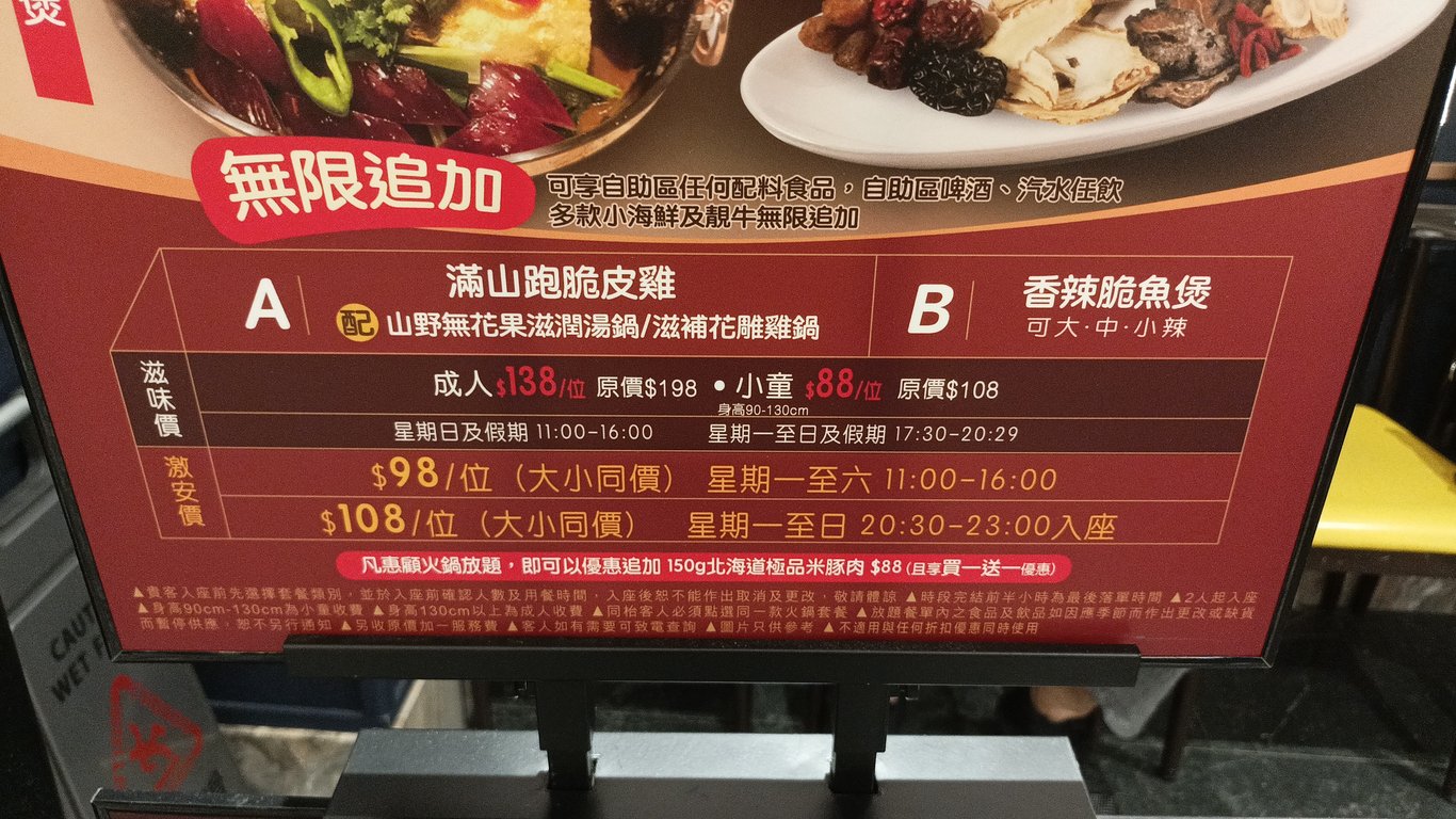 臨走的時候看一看壹號漁船的宣傳板,原來仍然有午市的98元自助火鍋供應,那還可以再光顧一下,雖然食材不太多選擇,勝在便宜也。