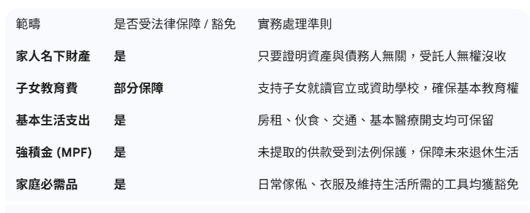 家人的收入與儲蓄:伴侶的薪金是其個人財產,無需上繳作還債之用,這確保了家庭仍有一份穩定的經濟來源來應付日常。