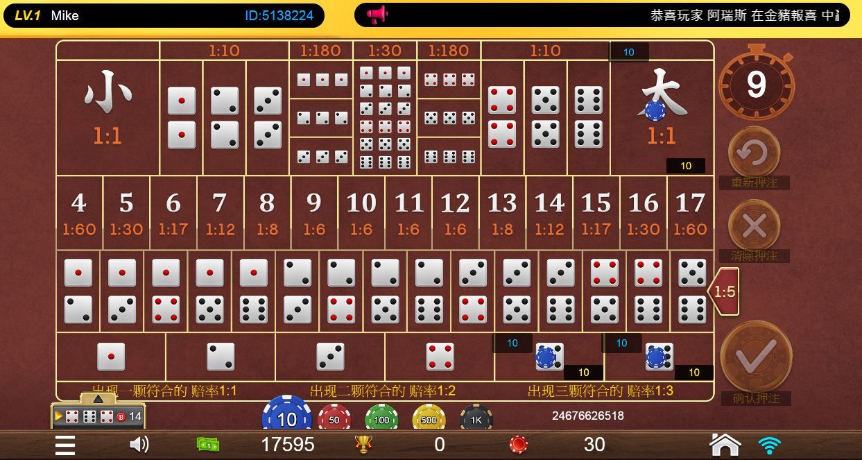 第三注:押三個地方,大、右下的五點、右下的六點,各押50 如果輸了