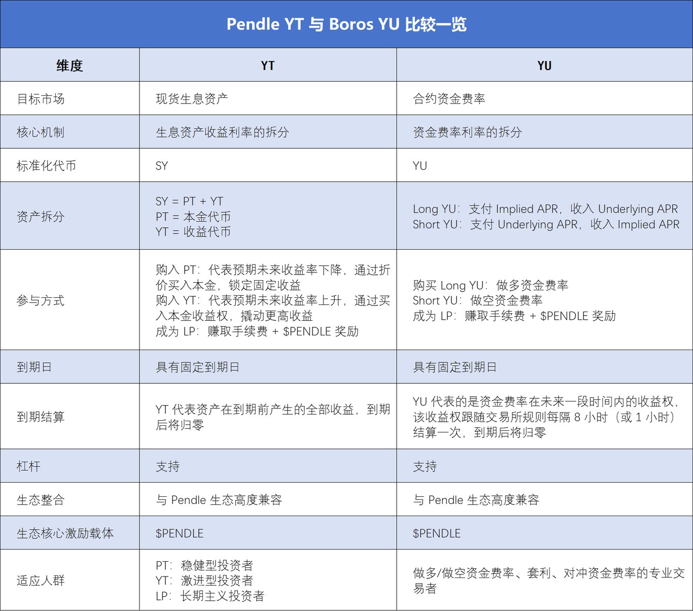 对于很多熟悉 Pendle YT 规则的人,确实 YT 与 YU 之间的很多相似之处,能够帮助用户加深对 YU 的理解,但二者在本质上也存在着很大区别,我们可以通过下方表格建立更清晰认知: