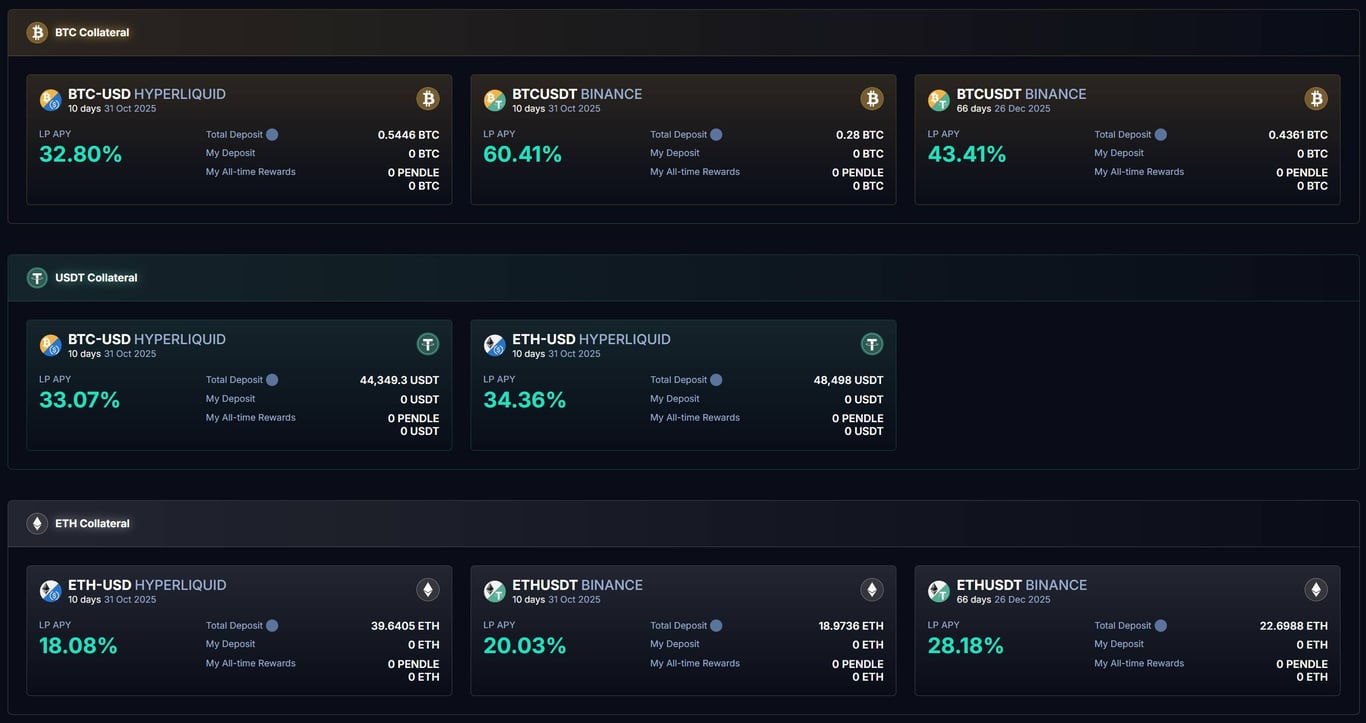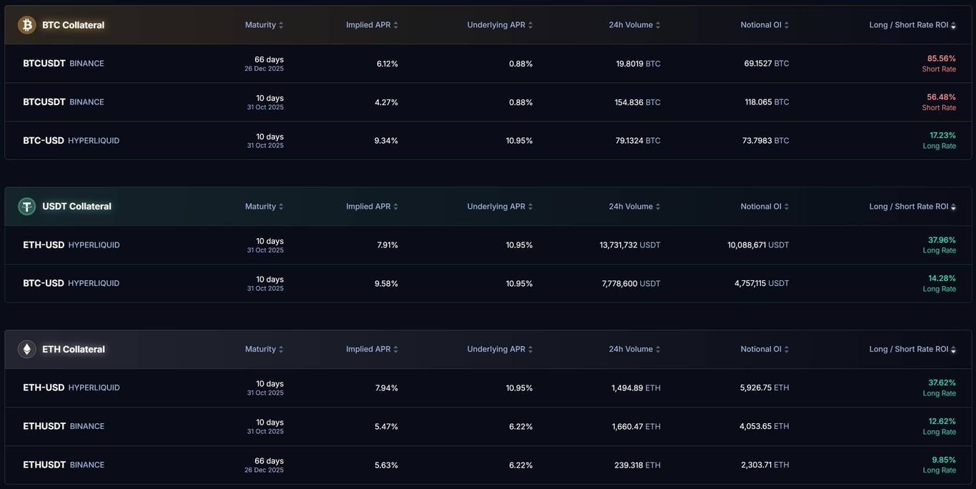 进入 Boros 页面我们可以看到,目前 Boros 已上线 Binance、Hyperliquid 的 BTC、ETH、USDT 多个市场: