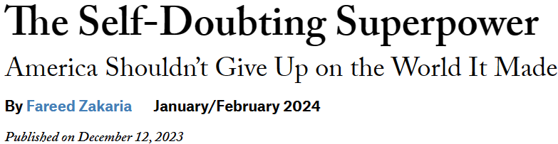 (作者是美国电视政论节目主持人,近著Age of Revolutions: Progress and Backlash From 1600 to the Present即将出版。本文原题“The Self-Doubting Superpower”,见于美国《外交事务》2024年1/2月号。译者听桥,对原文有多分段,对机器初步形成的译文有校阅。)