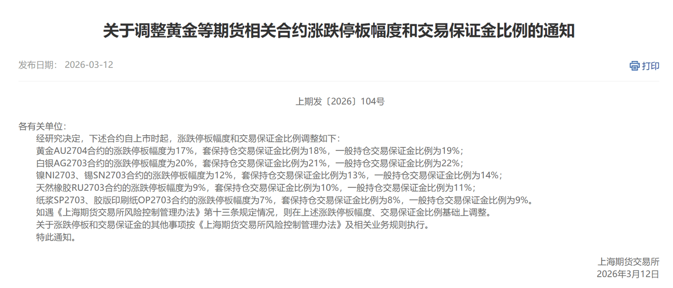 3月12日,再次调整:白银AG2703合约的涨跌停板幅度为20%、黄金AU2704合约的涨跌停板幅度为17%。