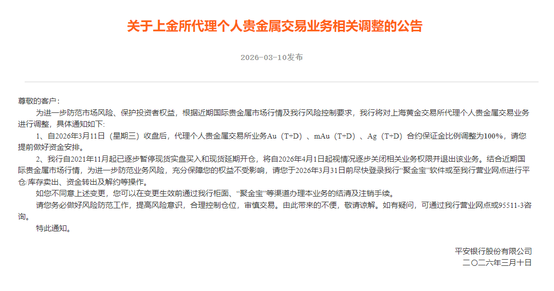 平安银行:4月1日起,视情况逐步关闭现货实盘买入和现货延期开仓业务权限并退出该业务。