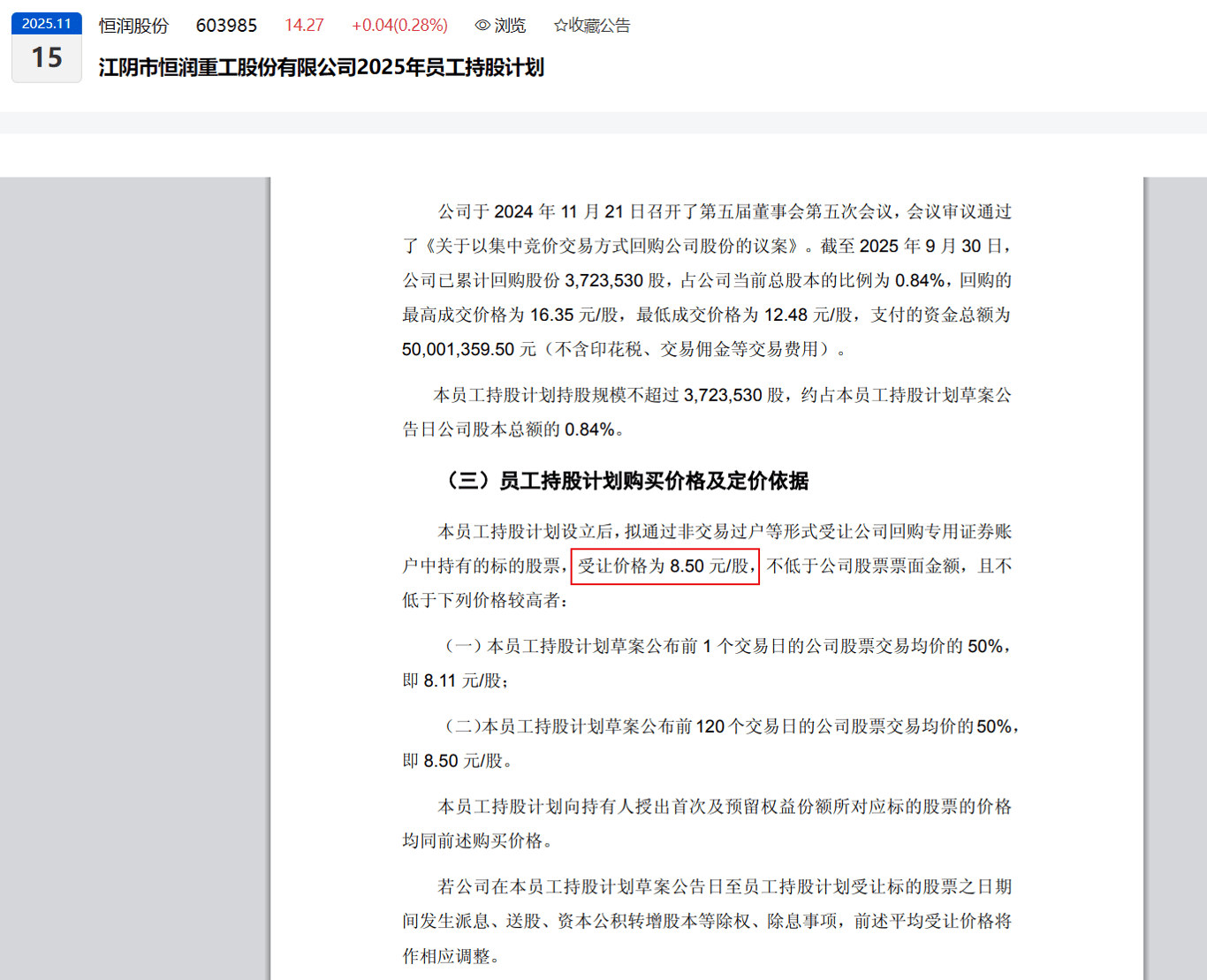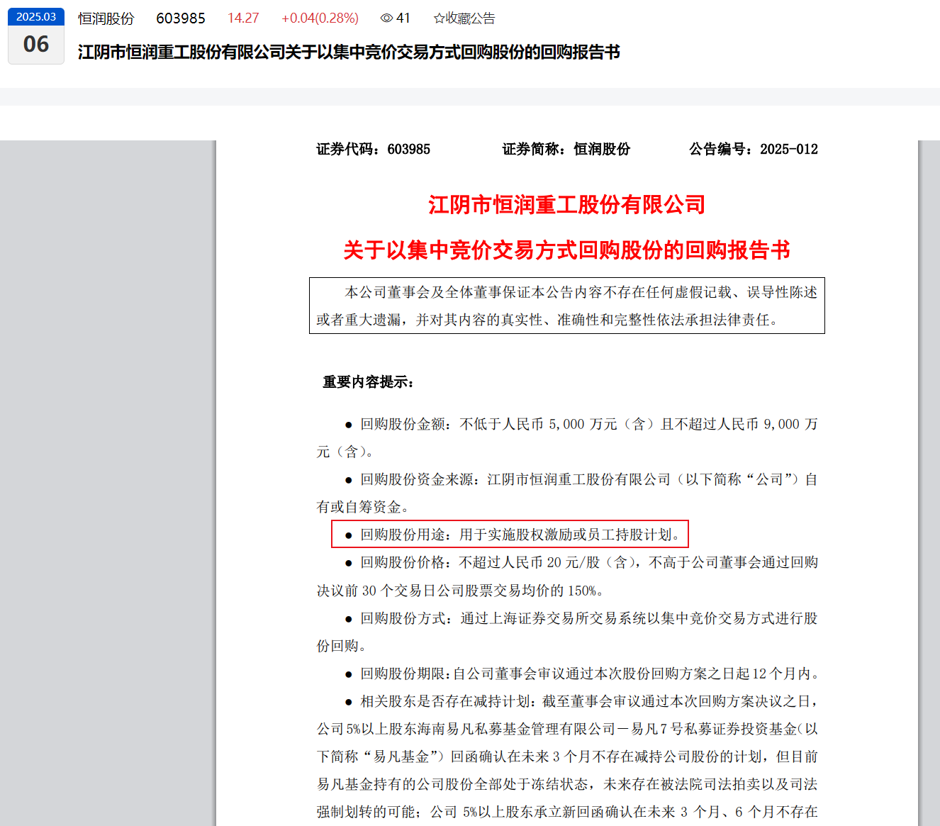 例如恒润股份,计划出资5000万-9000万回购股份,用于股权激励或员工持股计划。这种情况下,只要回购完成,就不是新增发的股票了,而是从二级市场实打实买回来的。最后,恒润股份花了5000万回购,员工持股计划是8.5元/股,也就是公司只能回收3165万,算是打6折卖给员工,这中间的将近2000万差价就是公司出的现金成本了。